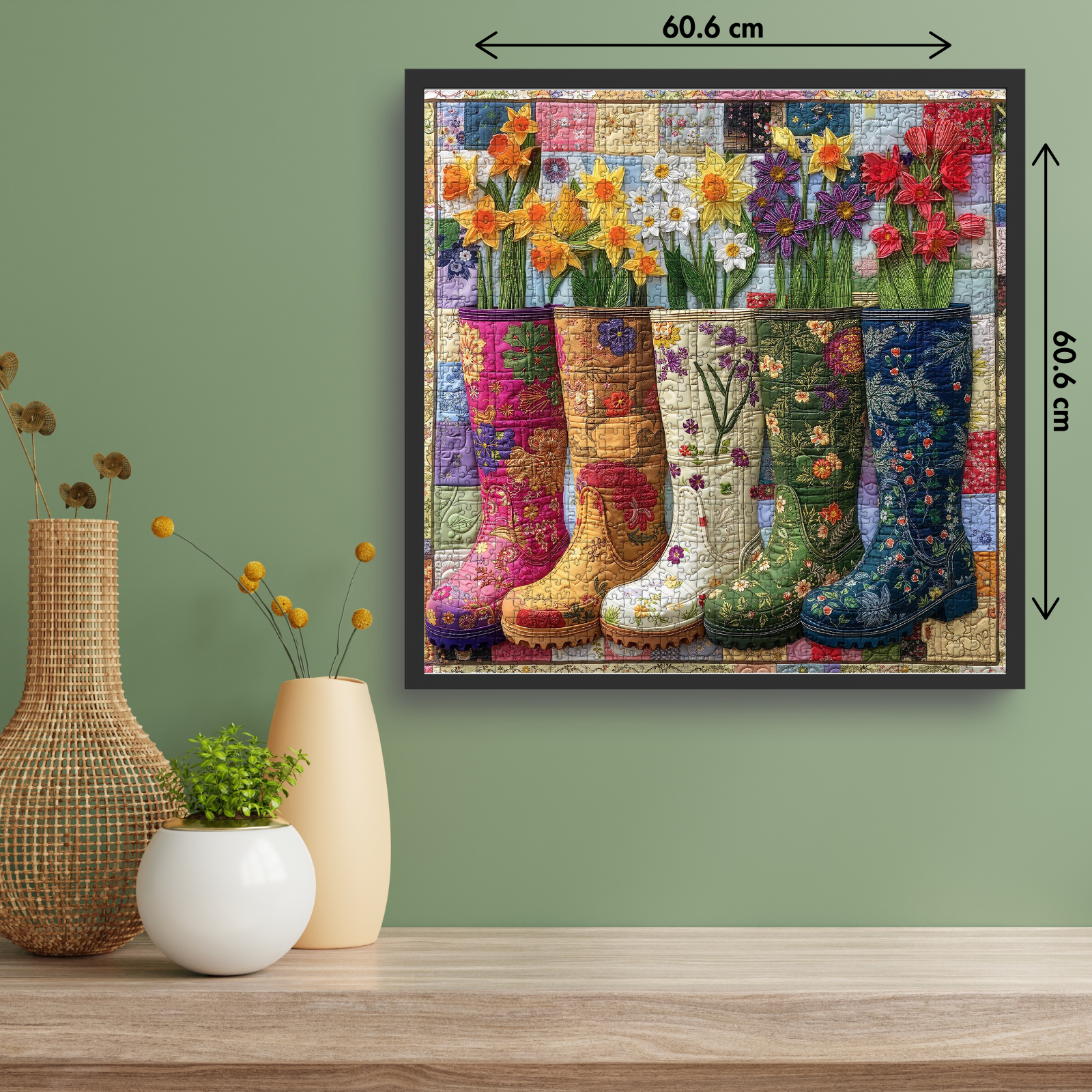 Vibrant Floral Design: This 1000 piece jigsaw puzzle features a row of colorful rain boots filled with blooming spring flowers, set against a charming quilted patchwork background. A cheerful garden scene that brings brightness to your puzzle time